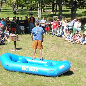 Our trips run on the last stretch of the crystal-clear Sturgeon River, where it slows down, offering an easier yet thrilling experience. We own the “Put-In” point, just 2 miles away on paved roads, and the journey ends at the beautiful Burt Lake State Park. The park features over 2,000 feet of sandy beach, perfect for swimming and playing, and a large picnic area with playground equipment under towering oak and pine trees. The rafts promote teamwork and are nearly impossible to tip over – a real relief for group leaders and parents!